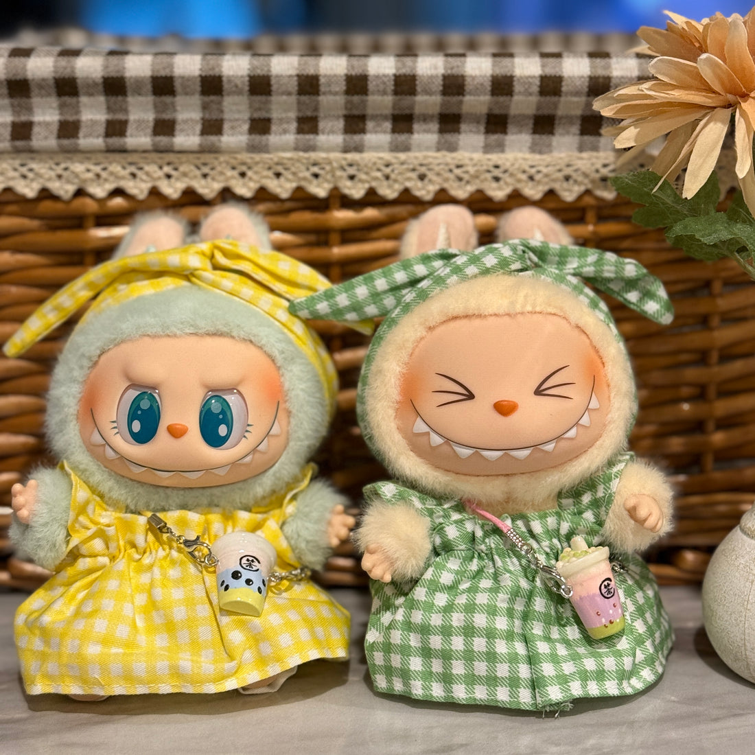 100% handmade Pop mart Labubu doll clothes boba tea girls in green and yellow 4...